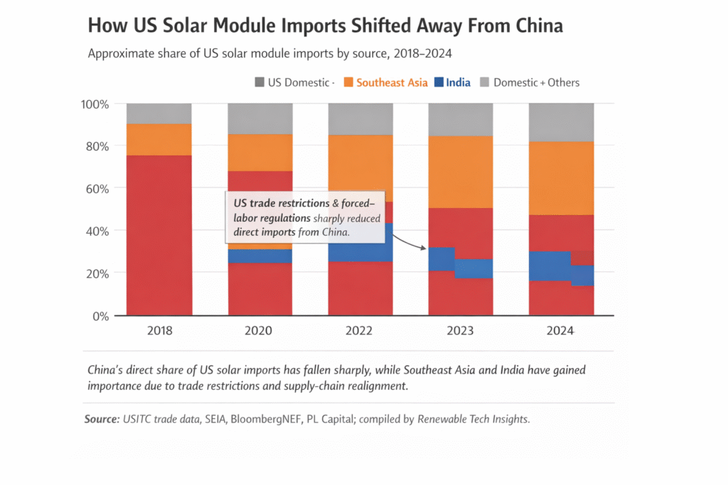 Cost competitiveness remains a critical factor. Indian modules are estimated to be 19–21% cheaper than those manufactured in the US, offering developers a clear cost advantage in a market where utility-scale solar projects remain highly price sensitive. This has helped India expand its share of US solar imports from roughly 3% in 2022 to around 10–12% by 2024. The shift is visible in US import data, which shows how China’s direct share has collapsed while India and Southeast Asia have gained importance.